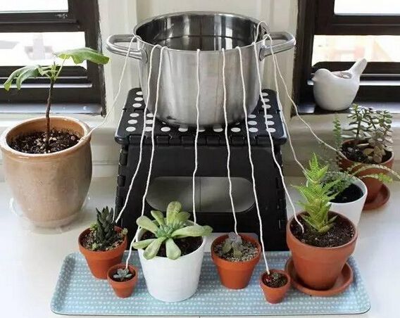 二是將水盆放在花盆旁邊,用幾根毛線或布條,一頭放在水里,一頭放在花盆里,讓毛線布條慢慢吸水。