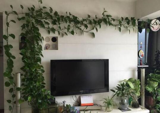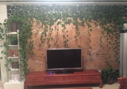 這有點繞梁一周的感覺了,夏天一定很清新,連電視墻都省了,從圖片上可以看出這顆綠蘿是水養的
