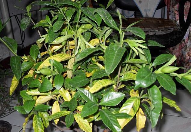 盆土長期過濕,造成土中缺氧,使部分須根腐爛,阻礙正常呼吸和水分養分的吸收,引起葉片變黃脫落。受害后先是嫩葉變成淡黃色,繼而老葉也漸漸發黃。