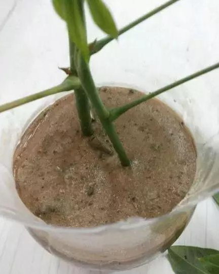 準備一個塑料瓶或被子,裝一半水,將扦插后的枝條涂抹生根粉后(家里沒有生根粉的不用涂),插入盛水的塑料瓶或杯子中。